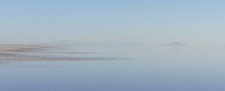 I hear people talk about it as they walk onto the salt flat. Especially on a day like today the sense of material and light becomes acute; there is no wind, no sound, and the site is flooded by a soft milky light that disguises the line where the sky meets the water. When I turn around I see the islands out there, seemingly afloat on the horizon.