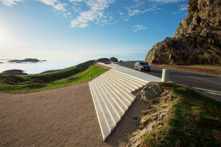 Gaute Brochmann anmelder i Morgenbladet 24 – 30 april en rasoverbygning på turistvegen E10 gjennom Lofoten, tegnet av arkitekt Knut Hjeltnes sammen med landskapsarkitektene Bjørbekk og Lindheim. Anmelderens poeng er at dette prosjektet, i motsetning til arkitektur i regi av Nasjonale Turistveger (NT), er strålende. Han proklamerer at “det i skyggen av det klamme Turistvegprosjektet har vokst fram en sunn bevissthet om at en fin vei er bedre enn en stygg vei” og etablerer en form for motsetning: På den ene siden finnes den arkitekturen som kun fungerer som “sminke”, til forskjell fra den som viser “moralsk ansvar for å skape adekvate rammer for menneskelig adferd”.